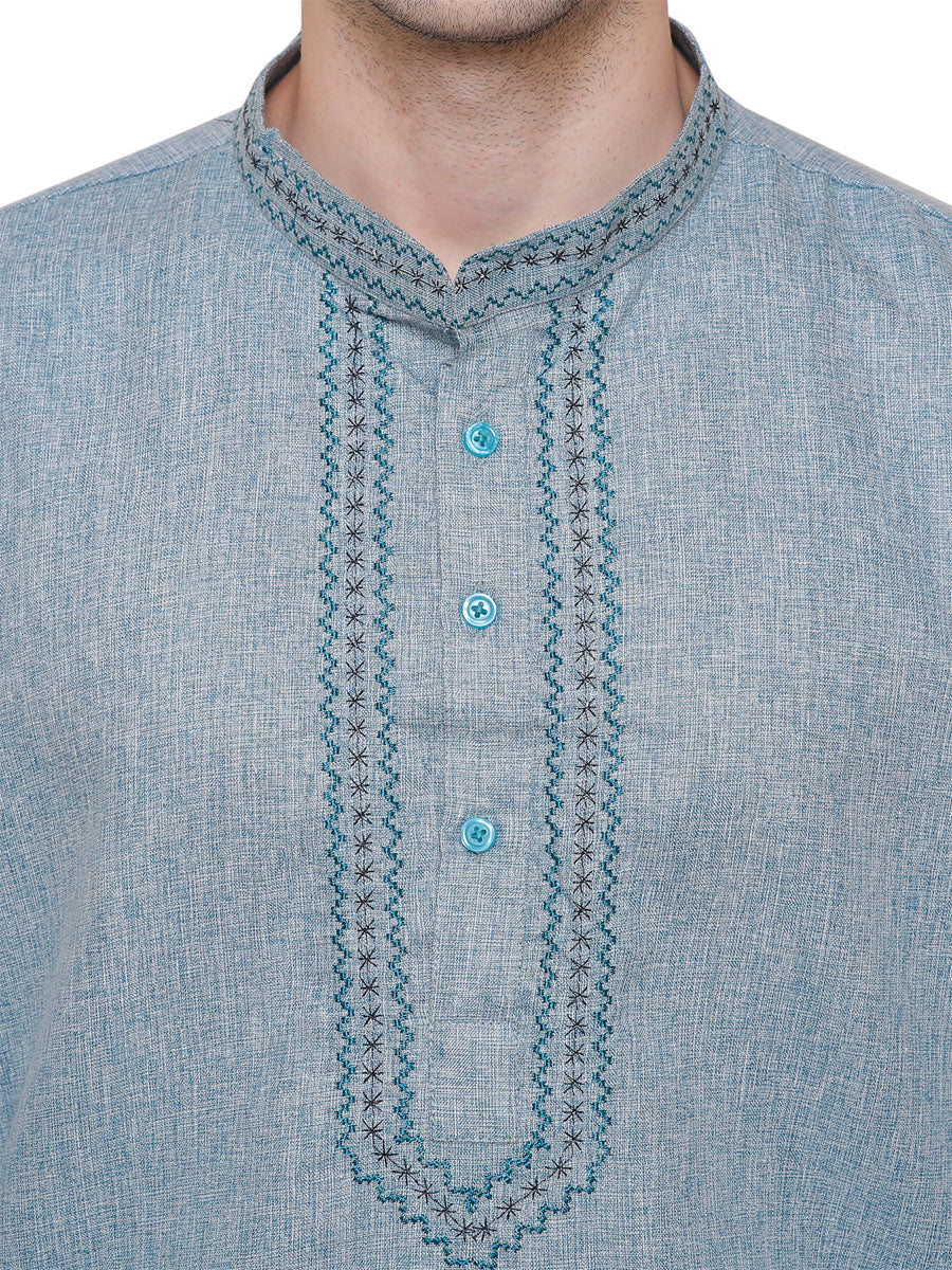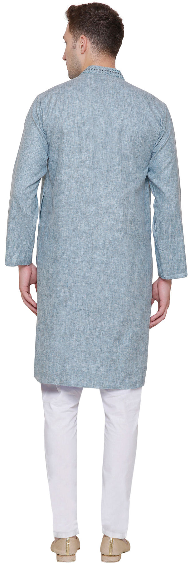 Kurta pajama set with elegant embroidery around neck in cotton fabric, ethnic men's wear from India. Loose comfortable fitting makes it a great wear. These cotton kurtas are worn in both summer and winter. Comes with complimentary free size white trouser (pajama) in soft fabric with drawstring in waist. Can be hand washed and machine washed. The Kurta is a knee length shirt, which is worn, mostly in white or pastel colors. Pajama is a lightweight drawstring trouser It is traditionally white or Light Sky Green in color. Highly comfortable and eminently suited to all climatic conditions, its use is widespread throughout the Indian subcontinent. Kurtas are often worn with jeans. Please see the size chart and check the measurement as per information below before you order.