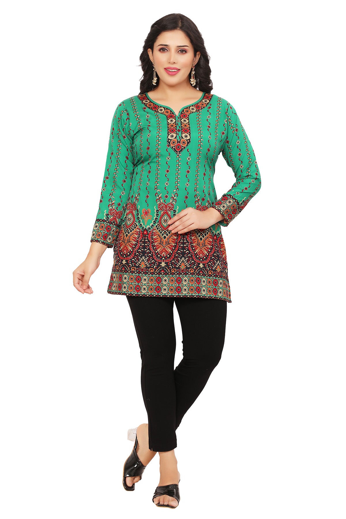 This graceful green short kurti showcases subtle ethnic pattern, making it an ideal pick for casual days or festive celebrations. Tailored for all-day comfort, it blends tradition with modern charm and offers a flattering fit that suits every body shape beautifully.