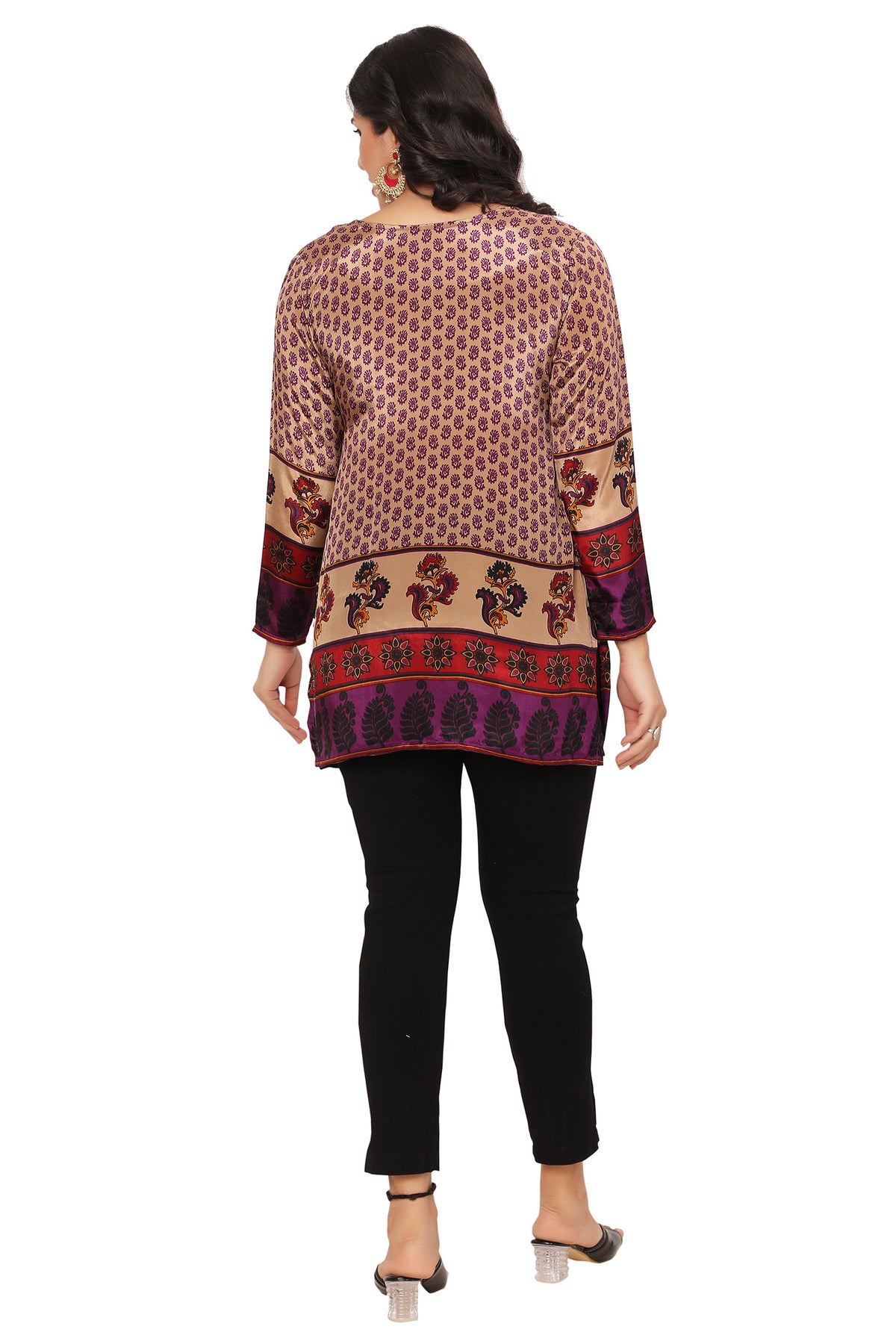 Embrace a blend of elegance and comfort with this lovely purple short kurti, featuring eye-catching ethnic prints. Perfect for everyday wear or festive celebrations, it offers a relaxed, flattering fit that complements every body type while adding a vibrant, graceful touch to your look.