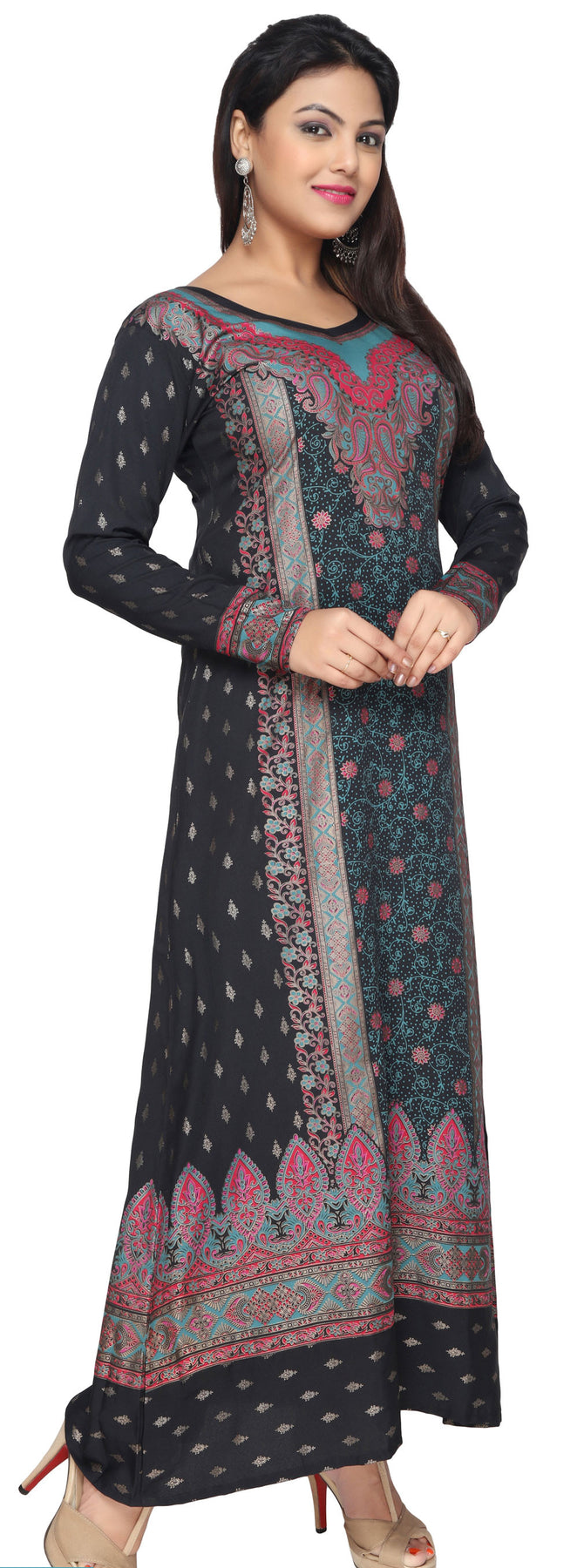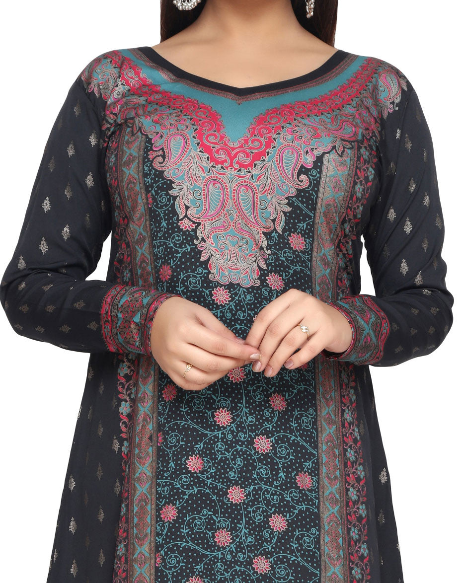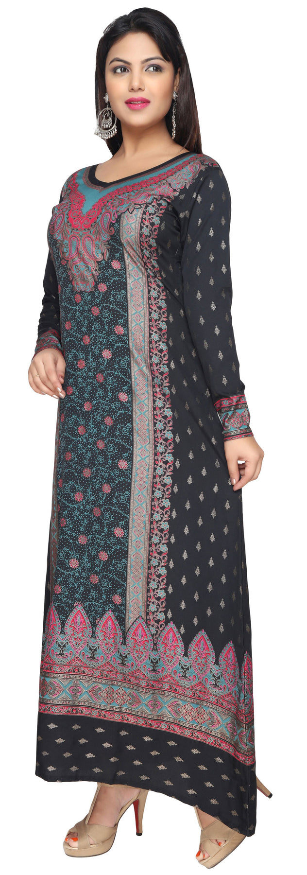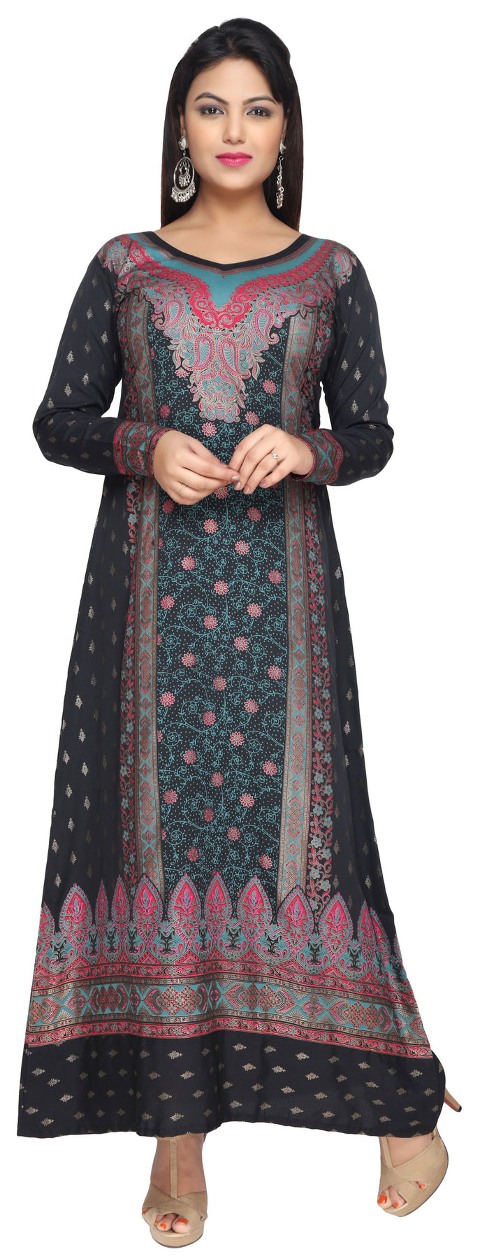 Evening Dress Printed Womens Long Caftan (Black-Turquoise)