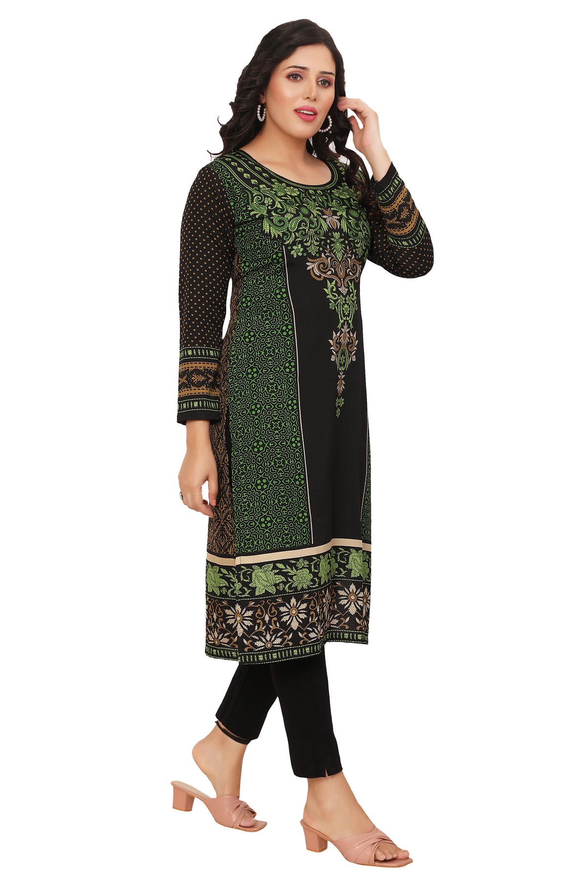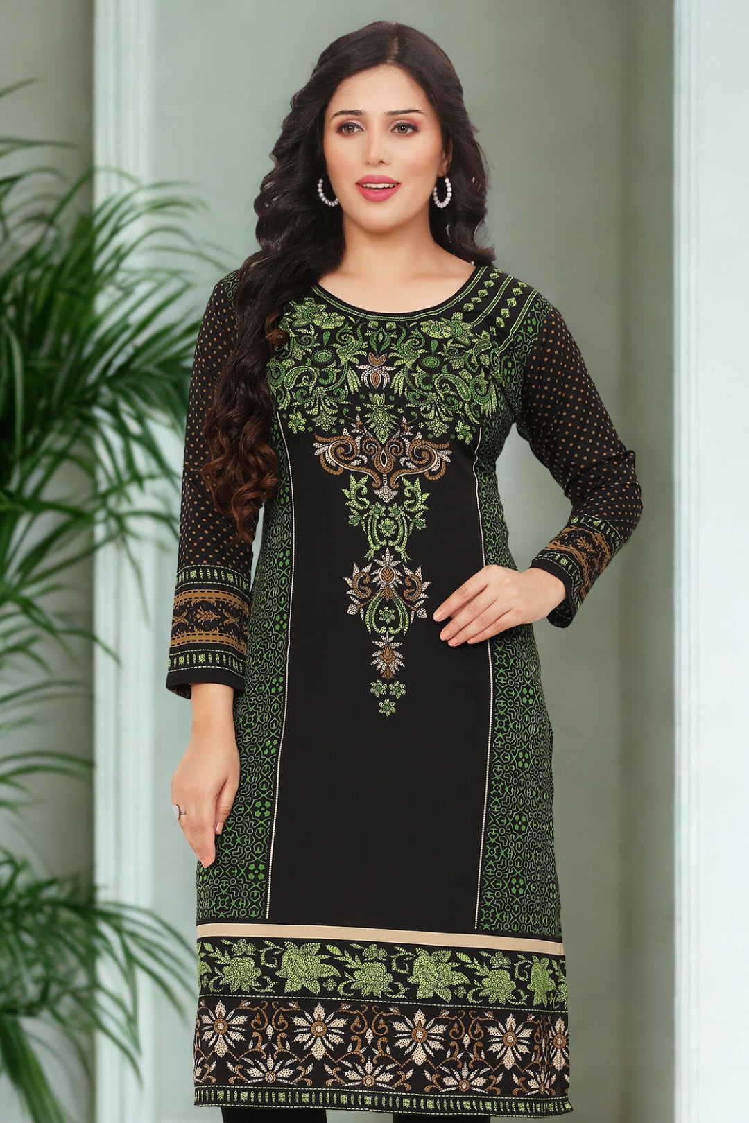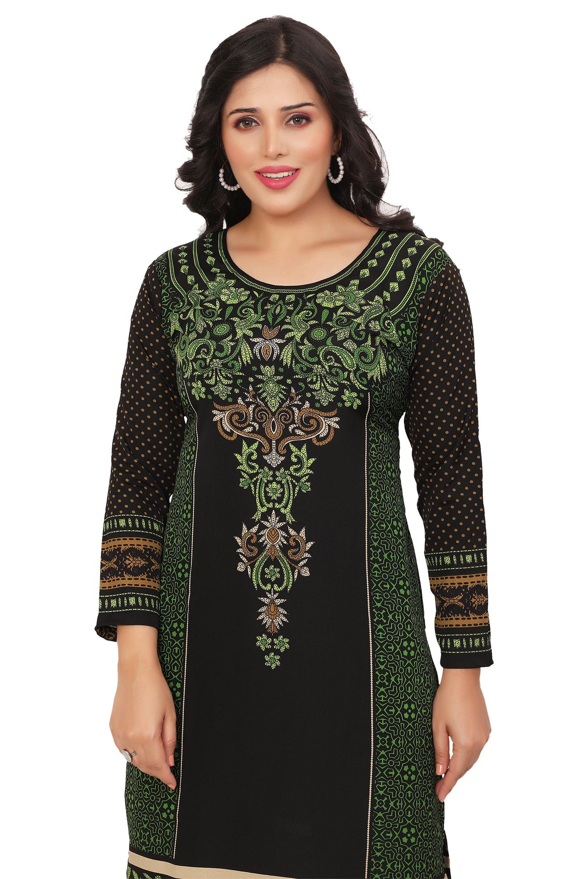 Make a striking impression with this elegant black-green long kurti, featuring a captivating printed central motif inspired by floral and paisley print. The rich color contrast adds depth, while the intricate design offers a touch of traditional artistry—perfect for festive events, casual wear, or cultural gatherings with graceful flair.