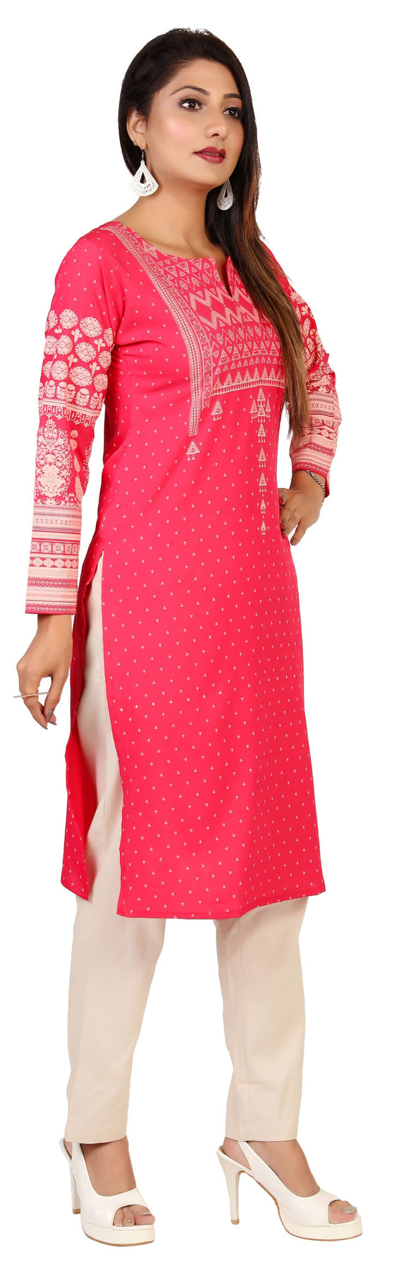 Add a vibrant touch to your wardrobe with this stunning pink long kurti for women. It combines timeless ethnic charm with a modern twist, featuring intricate printed designs along the neckline, sleeves, and hemline. The rich pink shade is perfect for uplifting your everyday look, making it ideal for work, casual outings, or festive occasions. Comfortable, elegant, and easy to wear—this kurti is a must-have for effortless style.