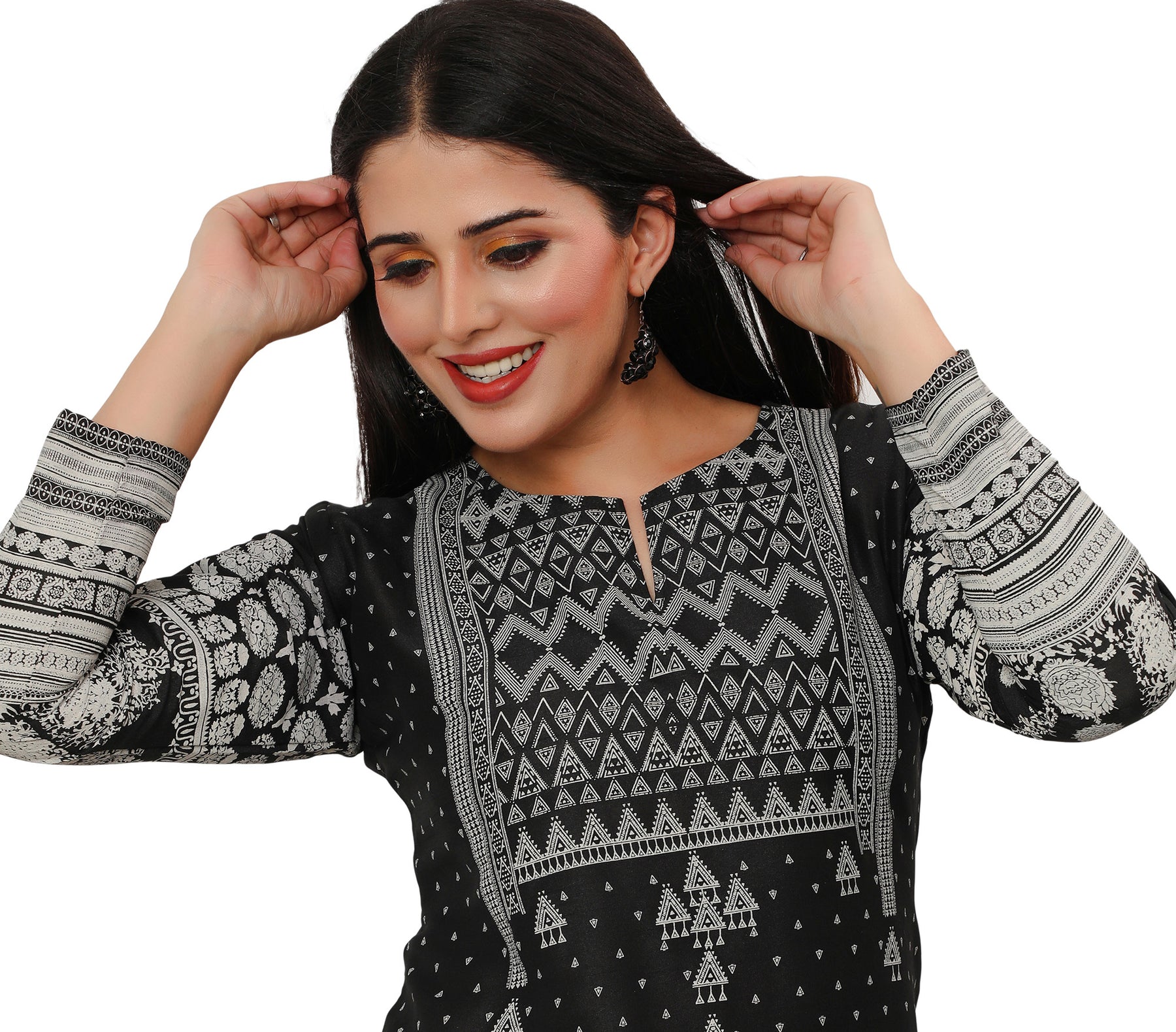 Make a timeless statement with this elegant black long kurti for women, adorned with intricate printed detailing on the neckline, sleeves, and hemline. The classic black shade adds versatility and sophistication, making it perfect for festive events, workdays, or casual outings. Designed for comfort and style, this kurti brings effortless grace to your everyday look.