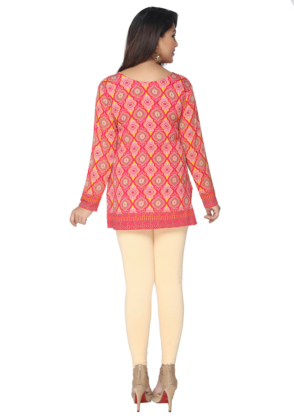 Upgrade your everyday wardrobe with this stylish red short kurti for women, designed with eye-catching patterns and a beautifully detailed neckline. The coordinated borders on the sleeves and hem enhance its trendy look. Perfect for casual outings or daily wear, it offers a flattering fit and comfortable feel for all-day ease and effortless style.