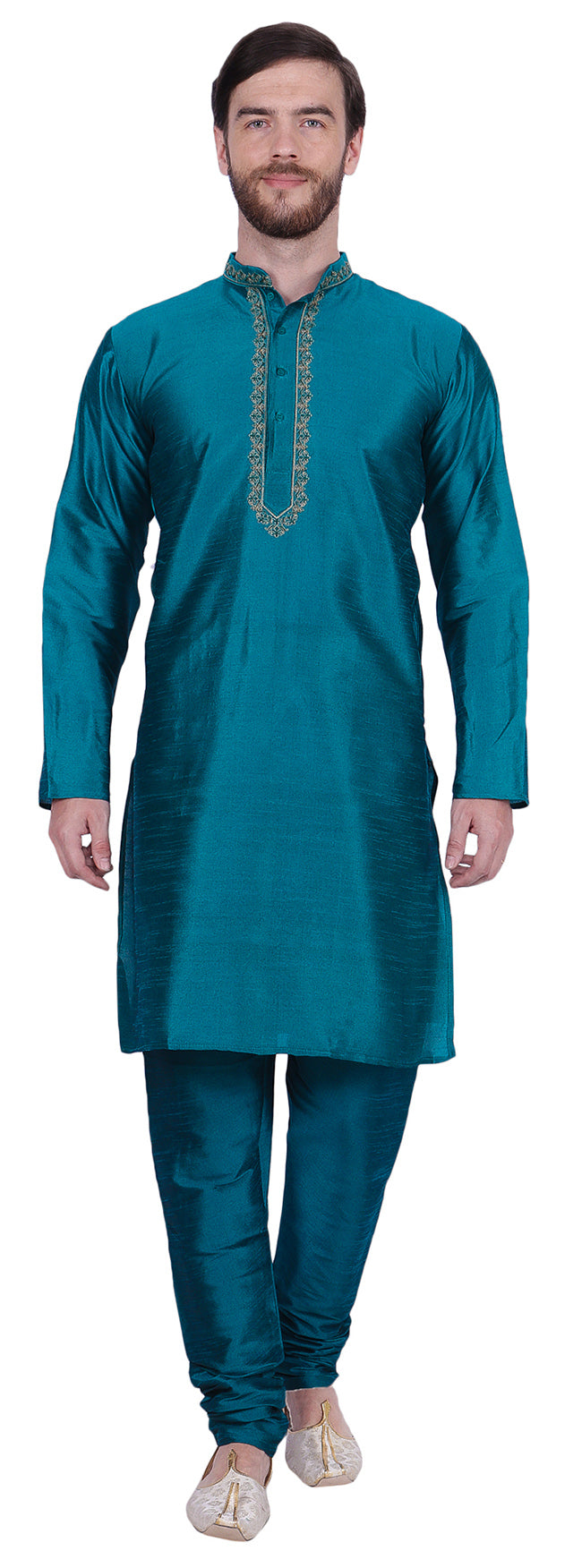 Men's Dupion Silk Kurta Pajama with Scarf India Clothing (Turquoise)