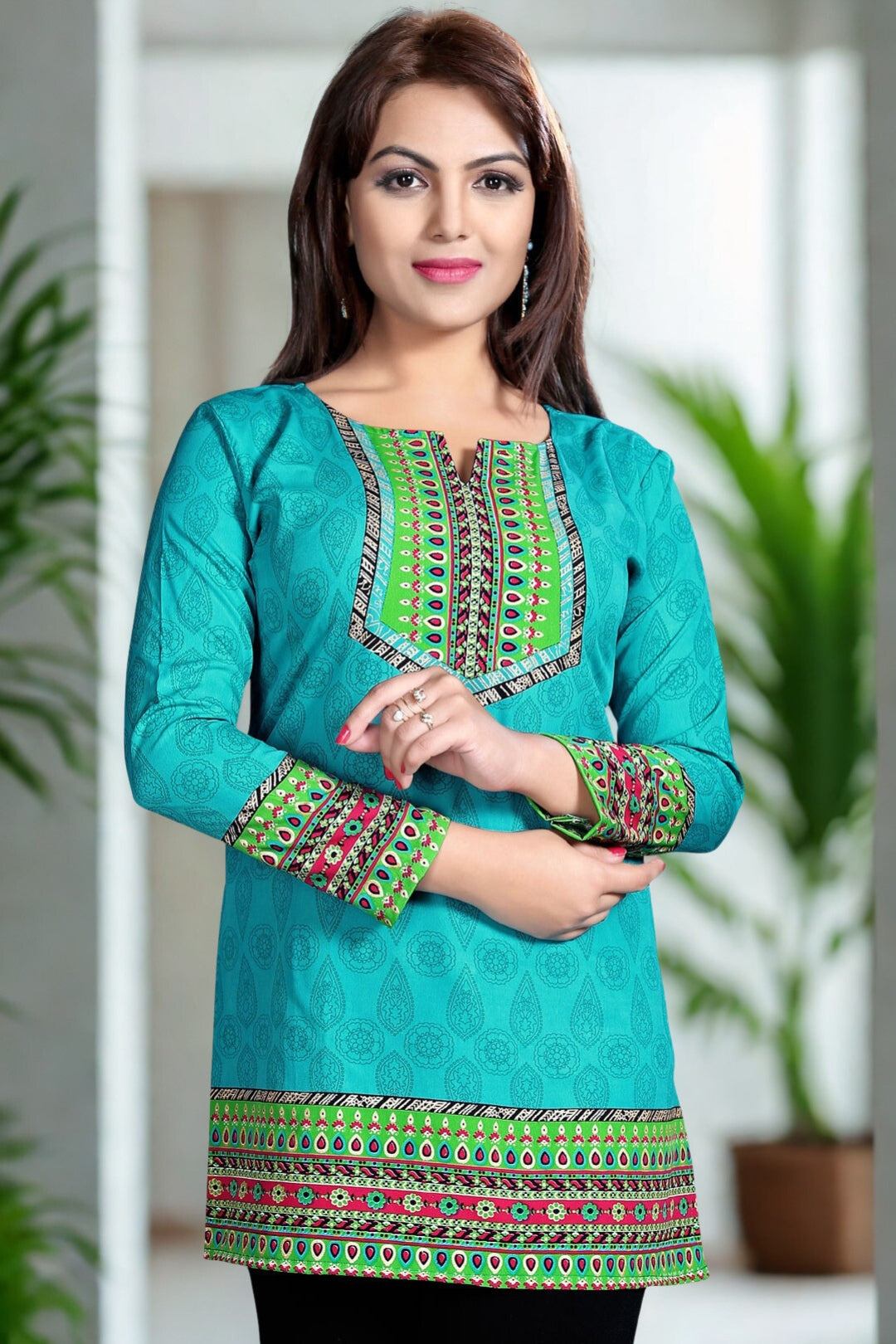 Step into ethnic elegance with this beautiful green short kurti, adorned with vibrant multicolor prints along the neckline, cuffs, and hemline. The subtle self-patterned base adds depth to the design, while the flattering fit ensures all-day comfort—perfect for festive gatherings, casual outings, or everyday traditional wear with a modern twist.