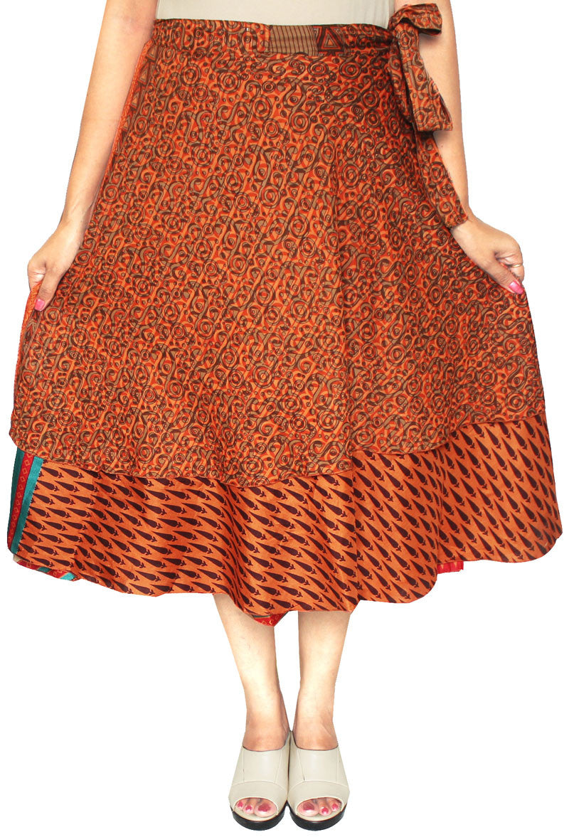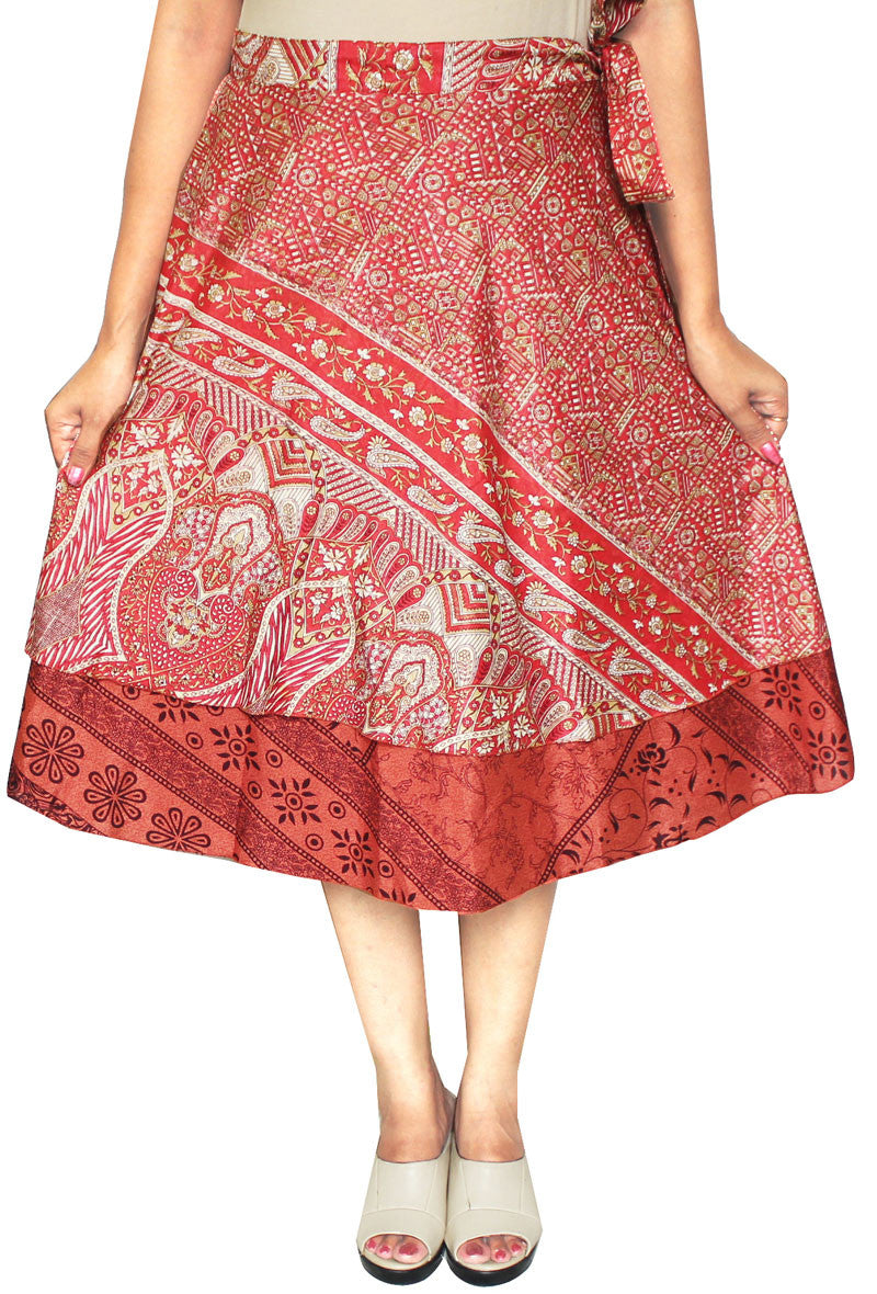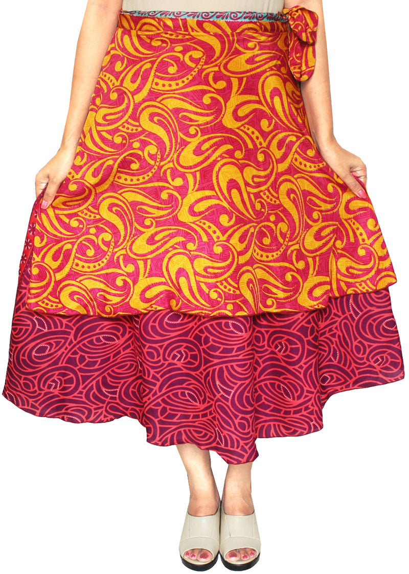Very popular printed magic beach wrap double layer reversible sari skirts made by the weavers of Jaipur, India using old silk, rayon and polyester saris (sarees). These stylish Indian skirts looks great when paired with your favorite Tops, Shirts, Kurtis and T-Shirts. Elegant, unique Indian wrap skirt is perfect for traveling, going to the beach or just hanging out. These wrap skirts are one size fits most, from size 0-14. No two skirts are same as only one skirt can be made from one old sari. These magic skirts can be worn as dress, skirt, beach cover, top and many other styles.