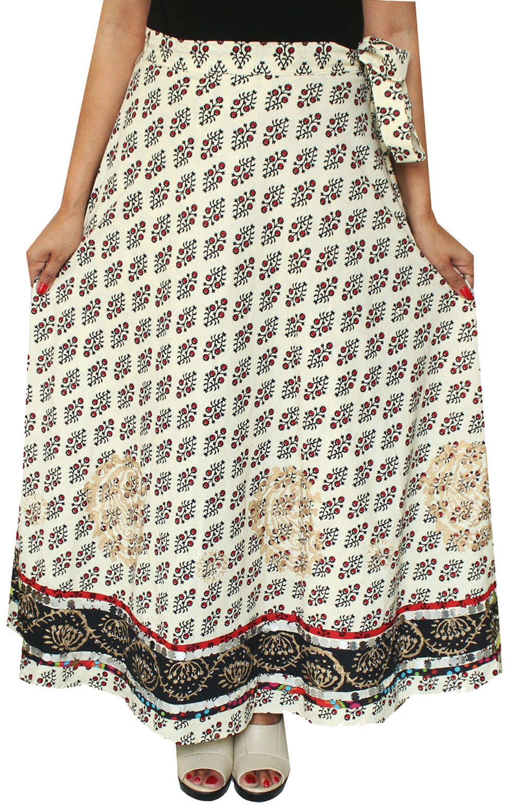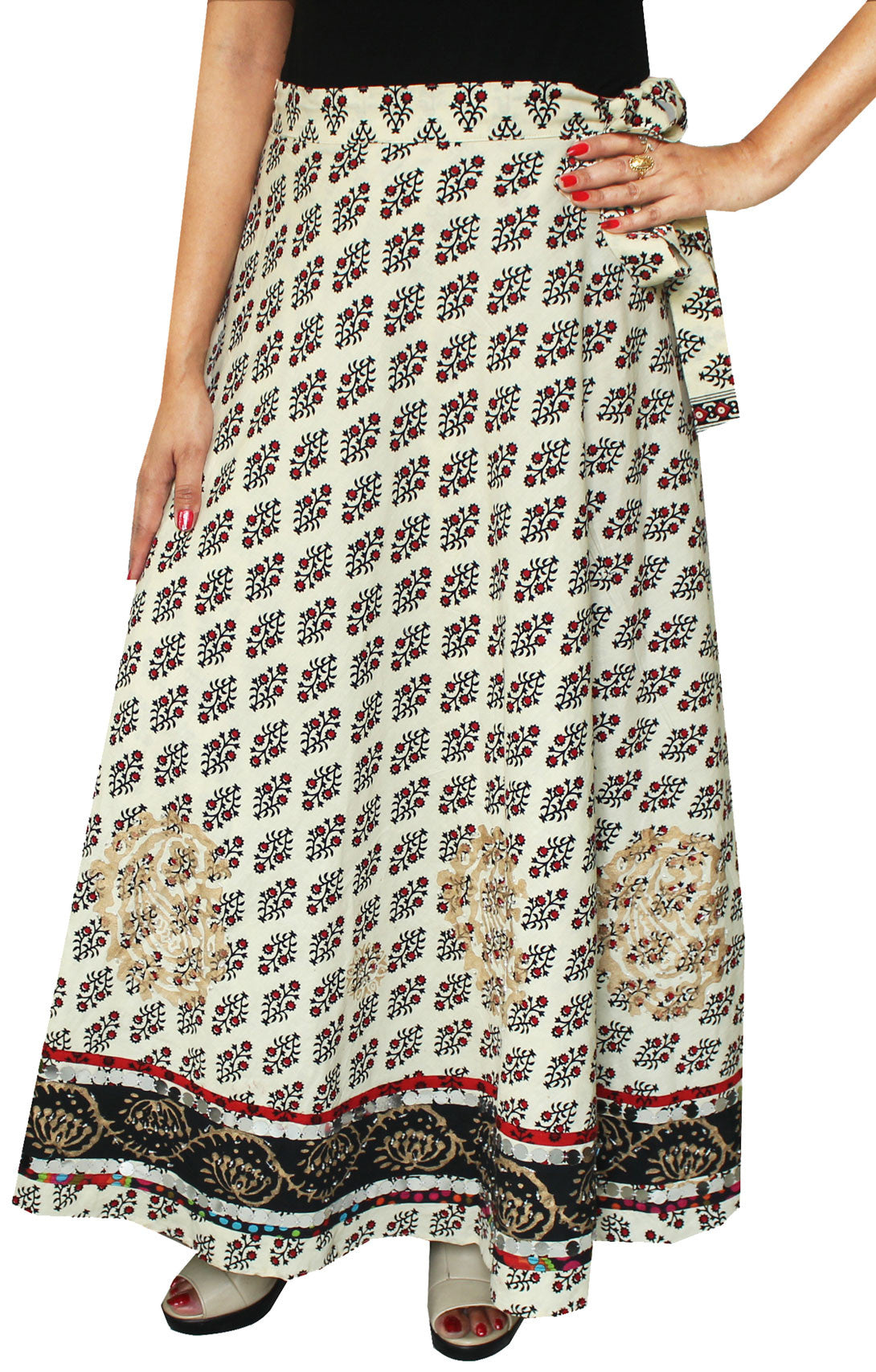 Cotton Printed Indian Long Wrap Around Maxi Beads Clothes (Off-White)
