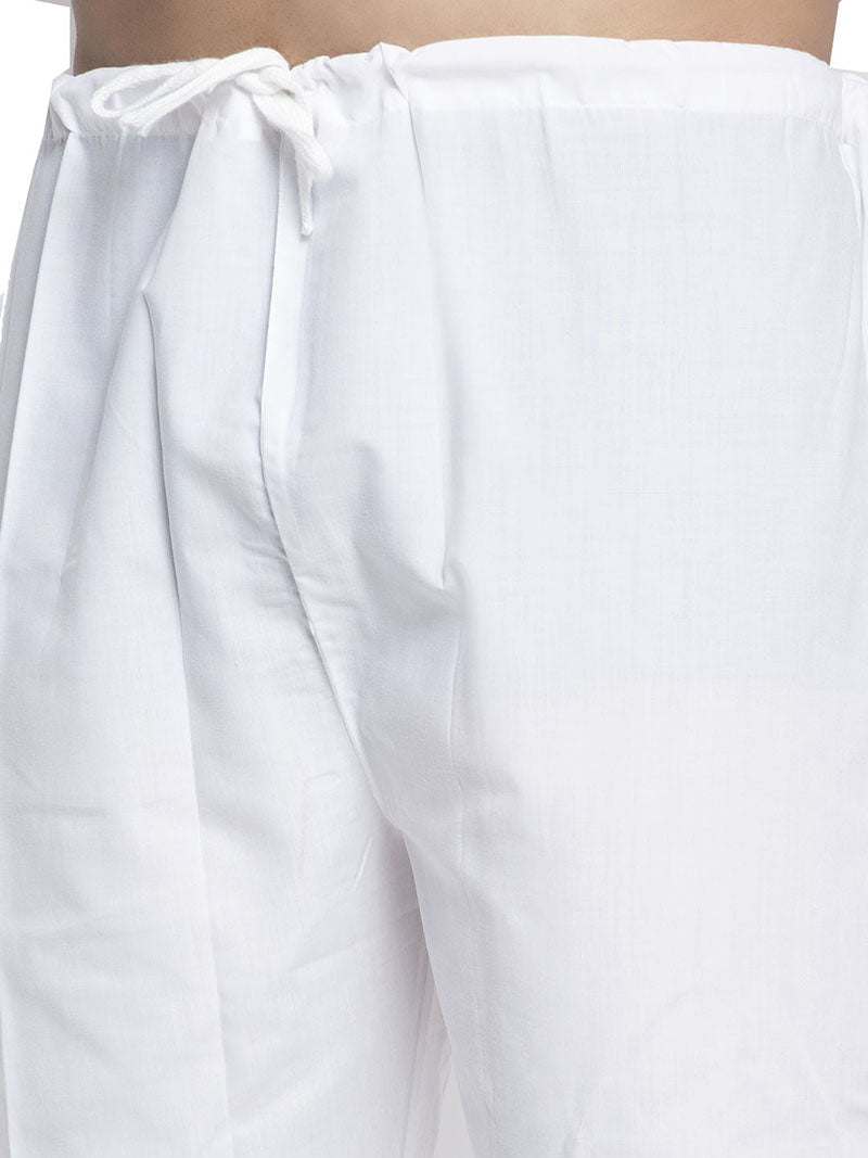 Kurta pajama set with mandarin collar, long regular sleeves, 2 pockets in ethnic motifs printed cotton fabric, men's casual wear evening dress from India. Loose comfortable fitting makes it a great wear. Comes with complimentary free size white trouser (churidaar pajama) in soft fabric with drawstring in waist. Pajama is a lightweight drawstring trouser which is traditionally white or light brown in color. Highly comfortable and eminently suited to all climatic conditions, its use is widespread throughout the Indian subcontinent. Kurtas are often worn with jeans. Please check the measurement as per information below before you order.