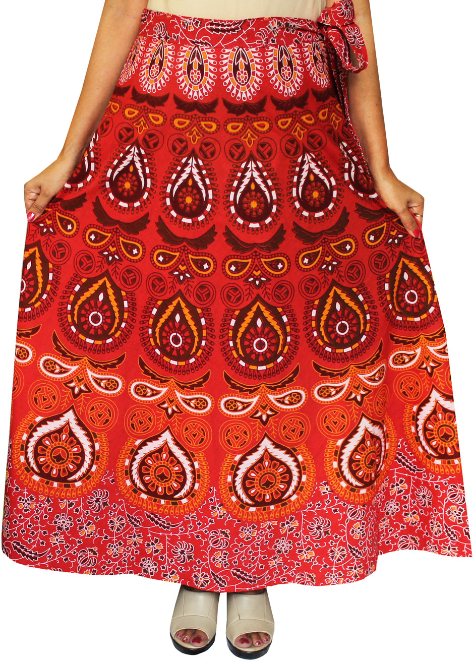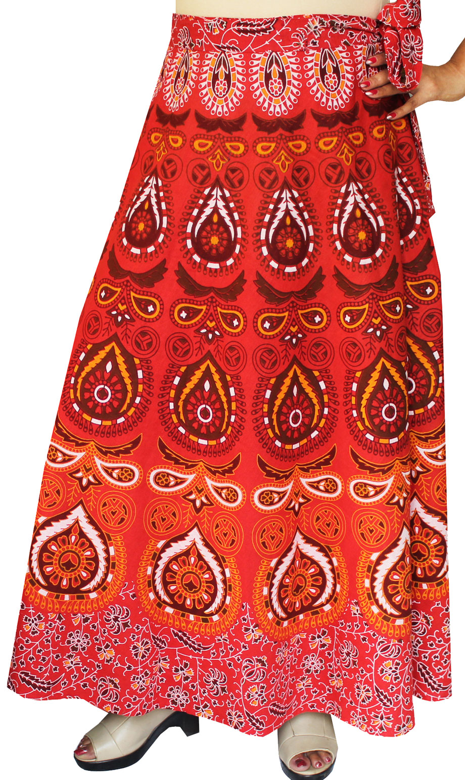 Indian Skirt Women's Cotton Printed Long Wrap Around Skirt (Red, One Size)